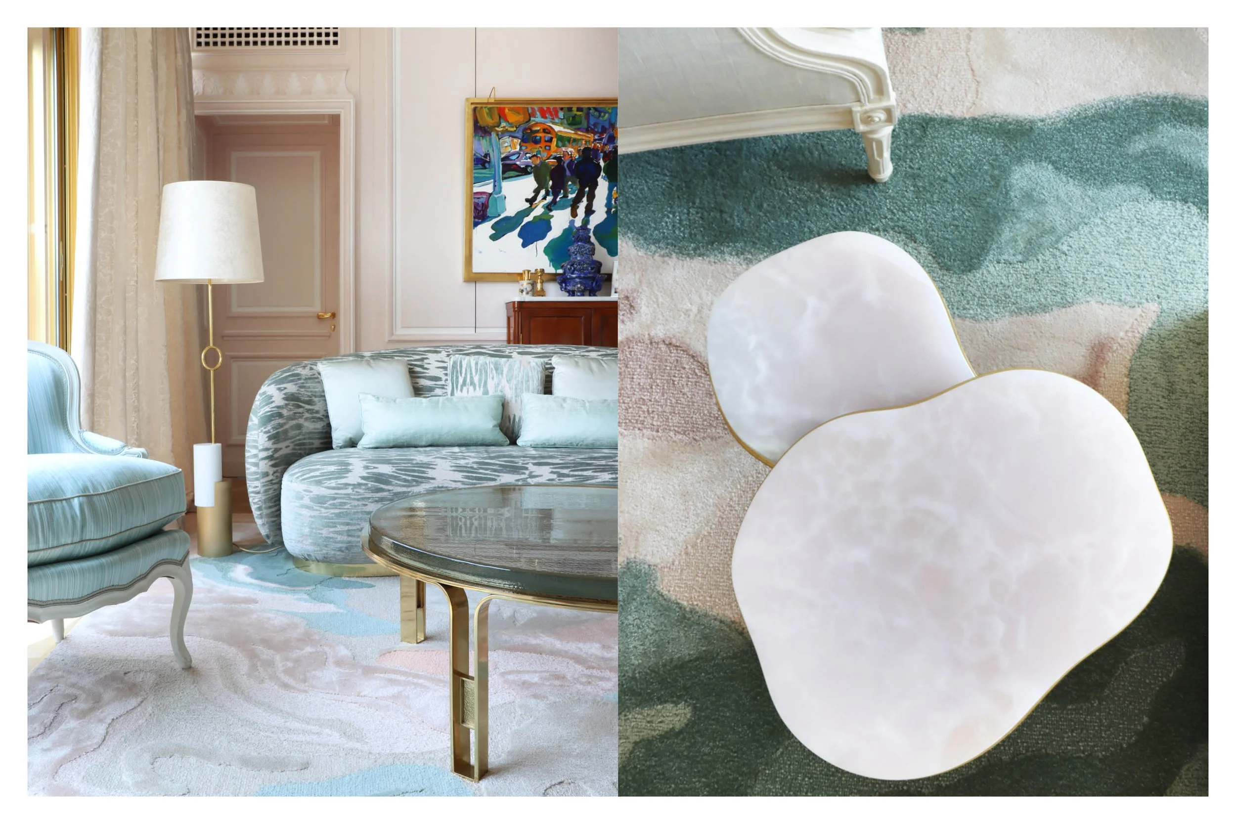 • Une image divisée en deux parties : à gauche, deux tables basses en surface blanche avec une finition marbrée, placées sur un tapis multicolore; à droite, un salon élégamment décoré avec un fauteuil blanc, un canapé rose pâle, une lampe de table et une peinture représentant une scène de rue animée.
