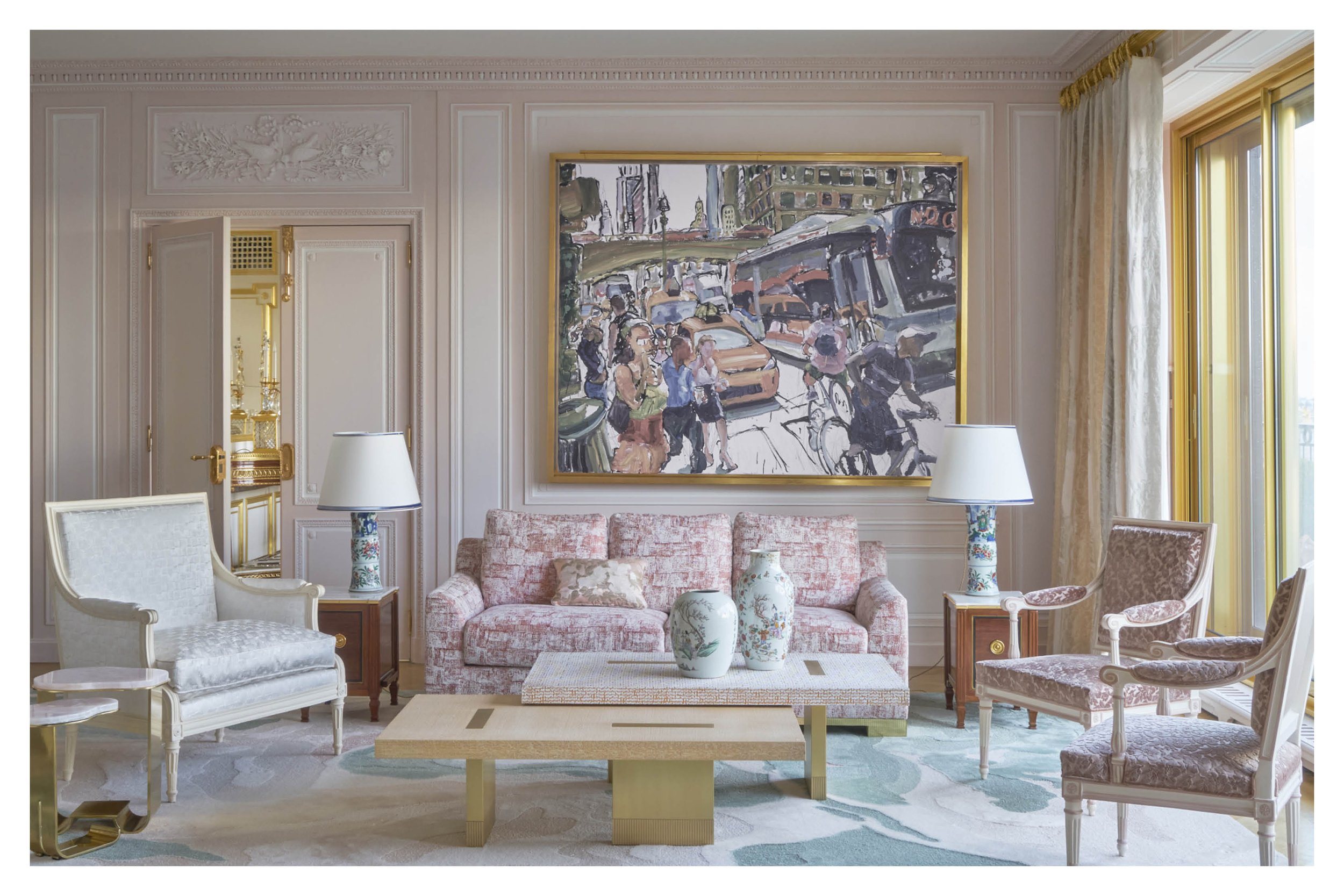 • Salon élégant avec des meubles vintage, des rideaux en tissu clair, une vue sur un balcon, décorations classiques, et un tableau moderne sur le mur.